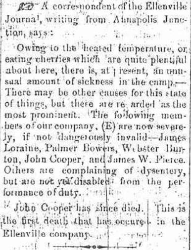There may be other causes for this state of things, but these are regarded as the most prominent. The following members of our company, (E) are now severely, if not dangerously invalid - James Loraine, Palmer Bowers, Webster Burton, John Cooper, and James W. Pierce. Others are complaining of dysentery, but are not yet disabled from the performance of duty.