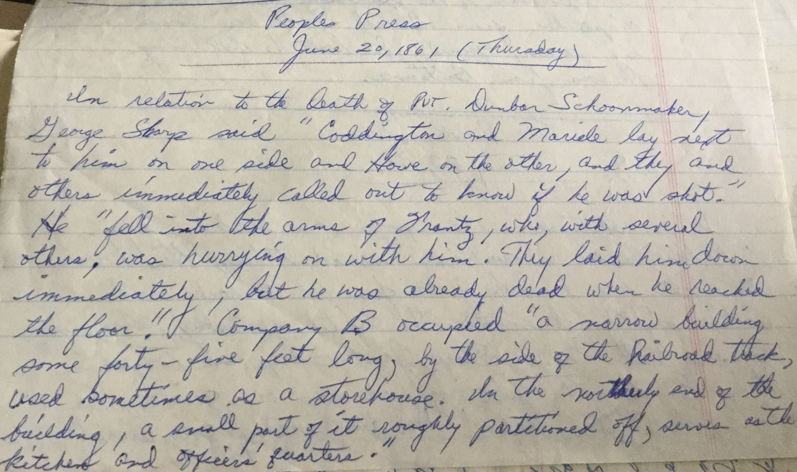 In relation to the Death of Pvt. Dunbar Schoonmaker, George Sharp said “Coddington and Maricle lay next to him on one side and Howe on the other, and they and others immediately called out to know if he was shot.”