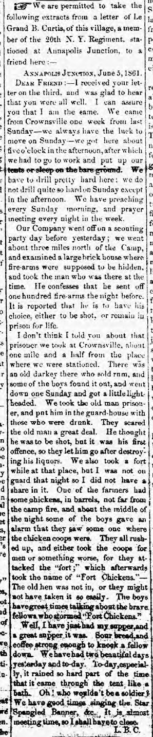 We are permitted to take the following extracts from a letter of Le Grand B. Curtis, of this village, a member of the 20th N. Y. Regiment, stationed at Annapolis Junction, to a friend here:—