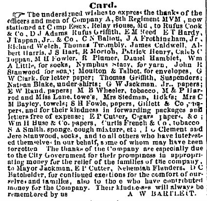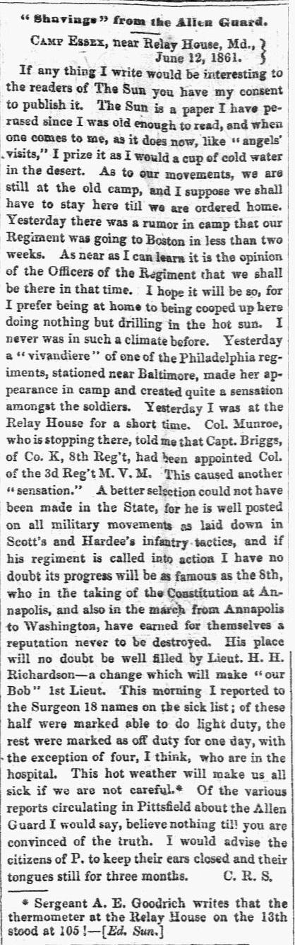 JULY 2.—Our camp was thoroughly aroused this morning by the report that the 11th Massachusetts Regiment was at the Relay station—guards were run by scores of men until Friday, no attempt was made to keep them in camp, and all hands started for the depot to see the Regiment. They numbered some one thousand and ten men, and were accompanied by Gilmore's Band of Boston— this band well deserves the reputation which it has won, and as they performed the Star Spangled Banner and Hail Columbia, we felt that revival of patriotism within us, which characterized our first starting for the wars, but which our monotonous life here had almost extinguished. the equipments of the Regiment are of a more substantial character than these which were provided for the three months troops strength not beauty is what the soldier wants. I was much surprised as well as pleased to meet a Pittsfield boy in the Regiment, in the person of Wm. Bassett, son of D. H. Basset —he was looking tough and hardy, and seemed in a good physical condition to withstand the hardships of the campaign. We wore awoke last night by one of our guard to view the comet which quite unexpectedly had just made its appearance.— It seemed much larger than the one that made its appearance some few years since, and all seemed surprised that we had not been apprised of its approach. The 6th Regiment has arrived from Baltimore bringing packing orders for the balance of the 8th Regiment to emigrate to that city to-night or in the morning. All seemed pleased with the idea and our camp has presented quite an animated appearance this evening—striking the tents belonging to the right wing of the Regiment at present in the city—packing up baggage, cooking extra rations and a huge bonfire have all seemed to occupy the attention and amuse the men. I enclose you a vote of thanks which was read to our highly respected captain in presence of the company, and endorsed by nine hearty cheers. It will perhaps convince you that the Berkshire boys are at all times ready for duty, but will at the same time demand those rights which belong to them as soldiers, The temperance tent was complimented by a serenade from the Lynn boys this evening, who have a fine Quartette club in their ranks, which from time to time have served to relieve the monotony of soldier life, and remind us of pleasures and associations which we have left behind us. Jeff. Davis was burned in effigy this evening in the presence of a largo number of the troops—his character does not stand above par here, I can assure you, and this is but preface to what he might receive were we able to gain possession of his person.