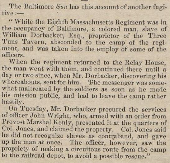 “While the Eighth Massachusetts Regiment was in the occupancy of Baltimore, a colored man, slave of William Dorbacker, Esq., proprietor of the Three Tuns Tavern, absconded to the camp of the regiment, and was taken into the employ of some of the officers.