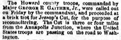 The Howard county troops, commanded by Major GEORGE R. GAITHER, Jr., were called out on Friday by the commandant, and proceeded at brisk trot for Jessop’s Cut, for the purpose of reconnoitering. The Cut is three or four miles from the Annapolis Junction, where the United States troops are passing on the road to Washington.